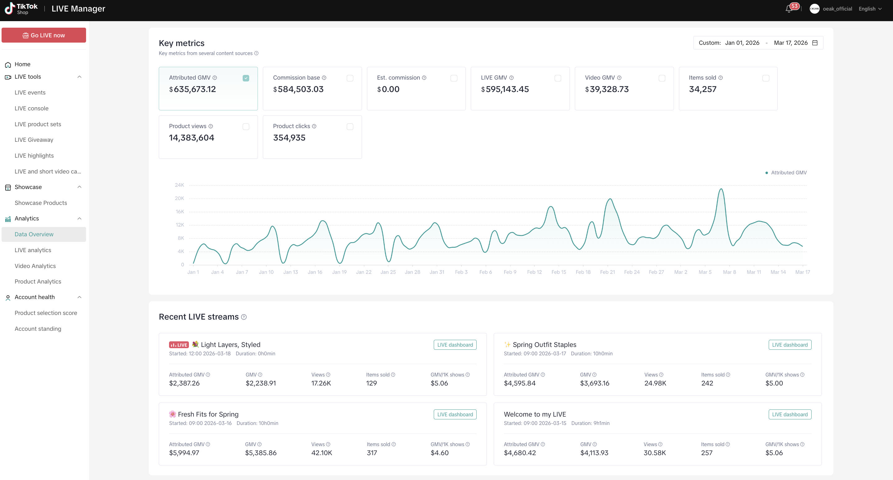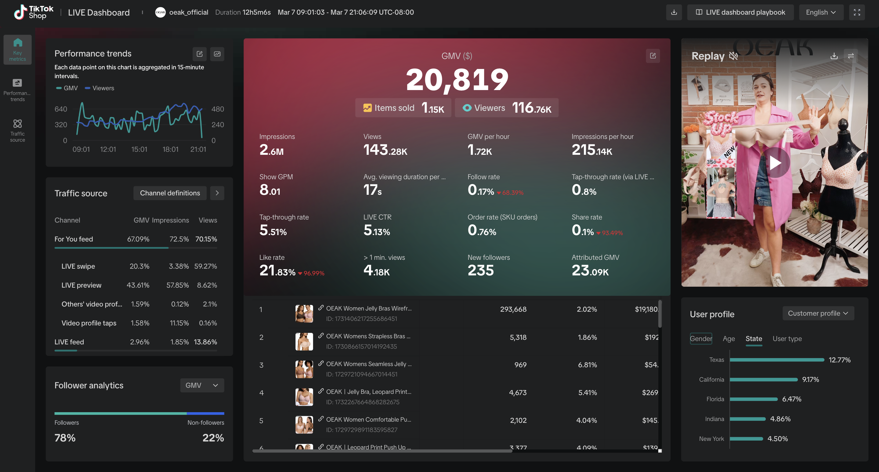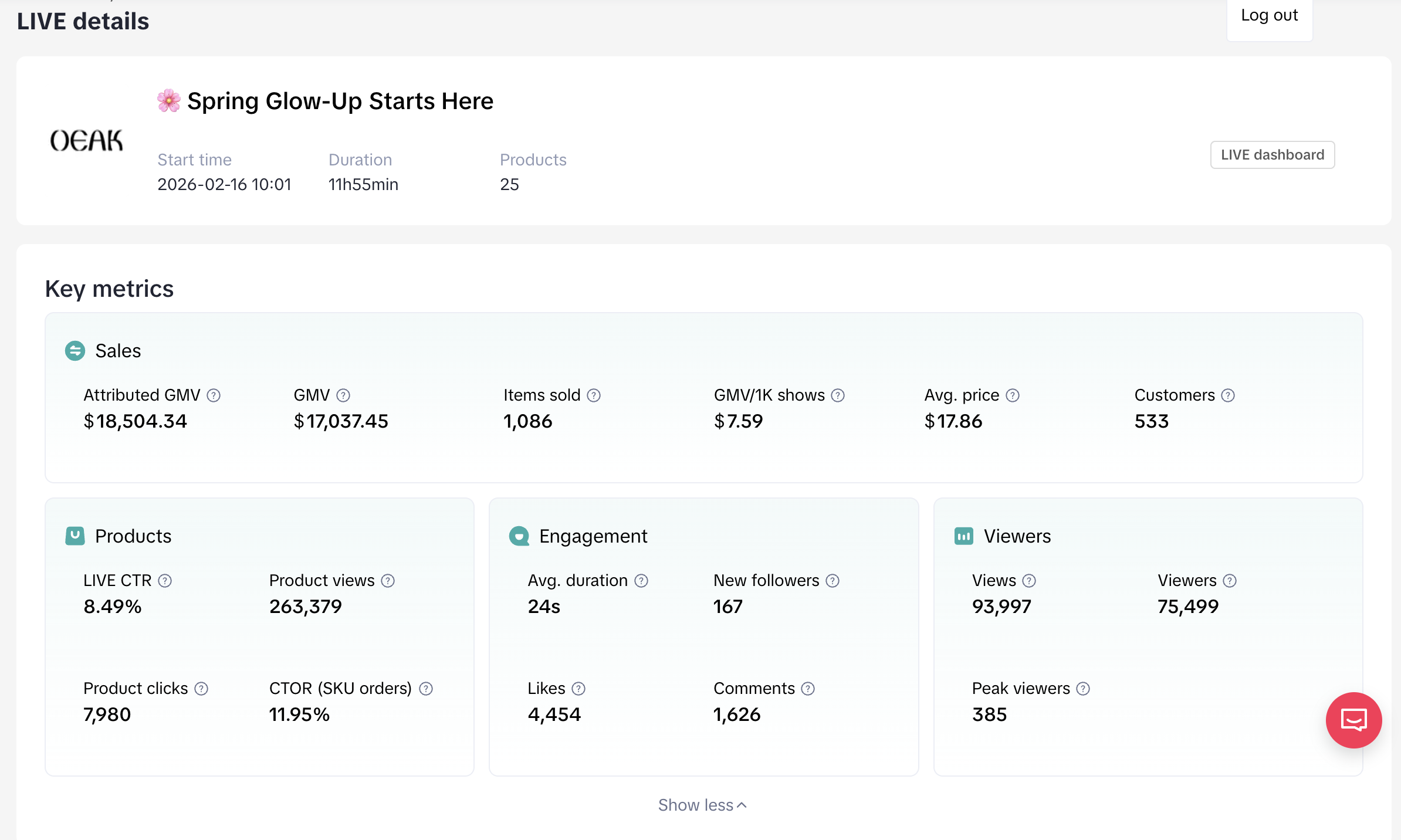 Leveraged real-time analytics and sales data to continuously refine strategies, resulting in over $700K in GMV year-to-date. By combining strategic planning, operational oversight, and performance-driven execution, helped establish OEAK Bras as a top-performing TikTok Shop account with strong audience engagement and sustainable revenue growth.