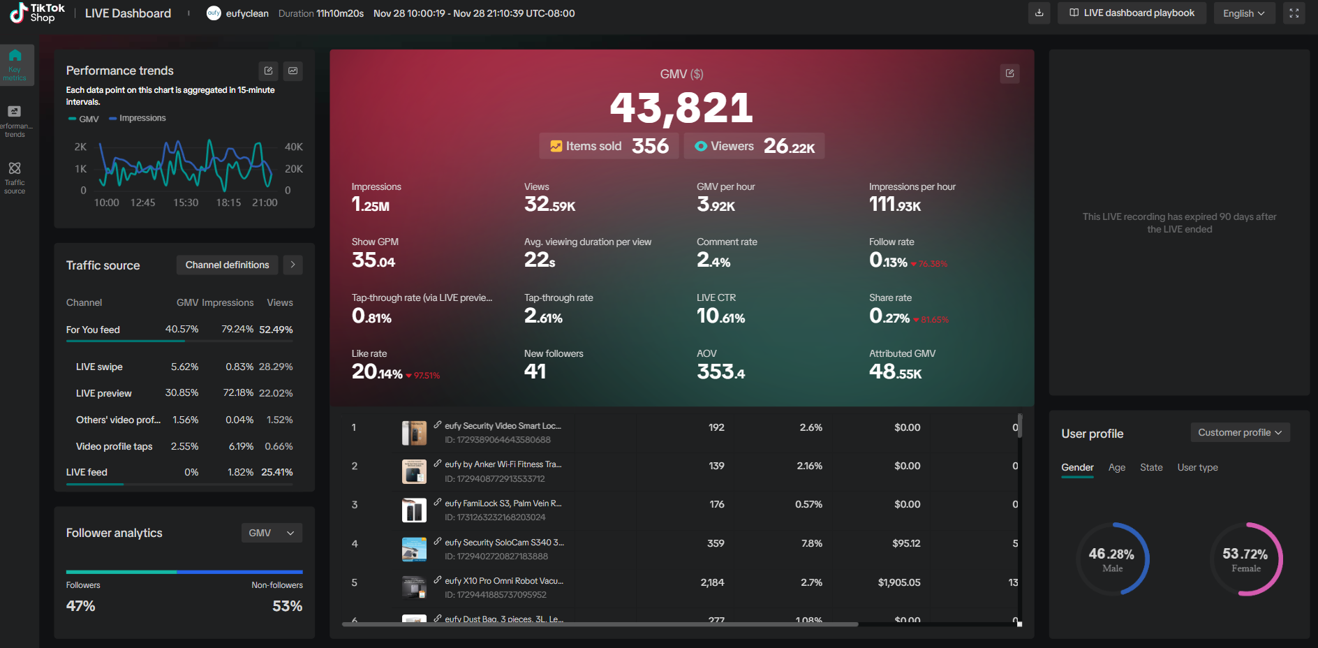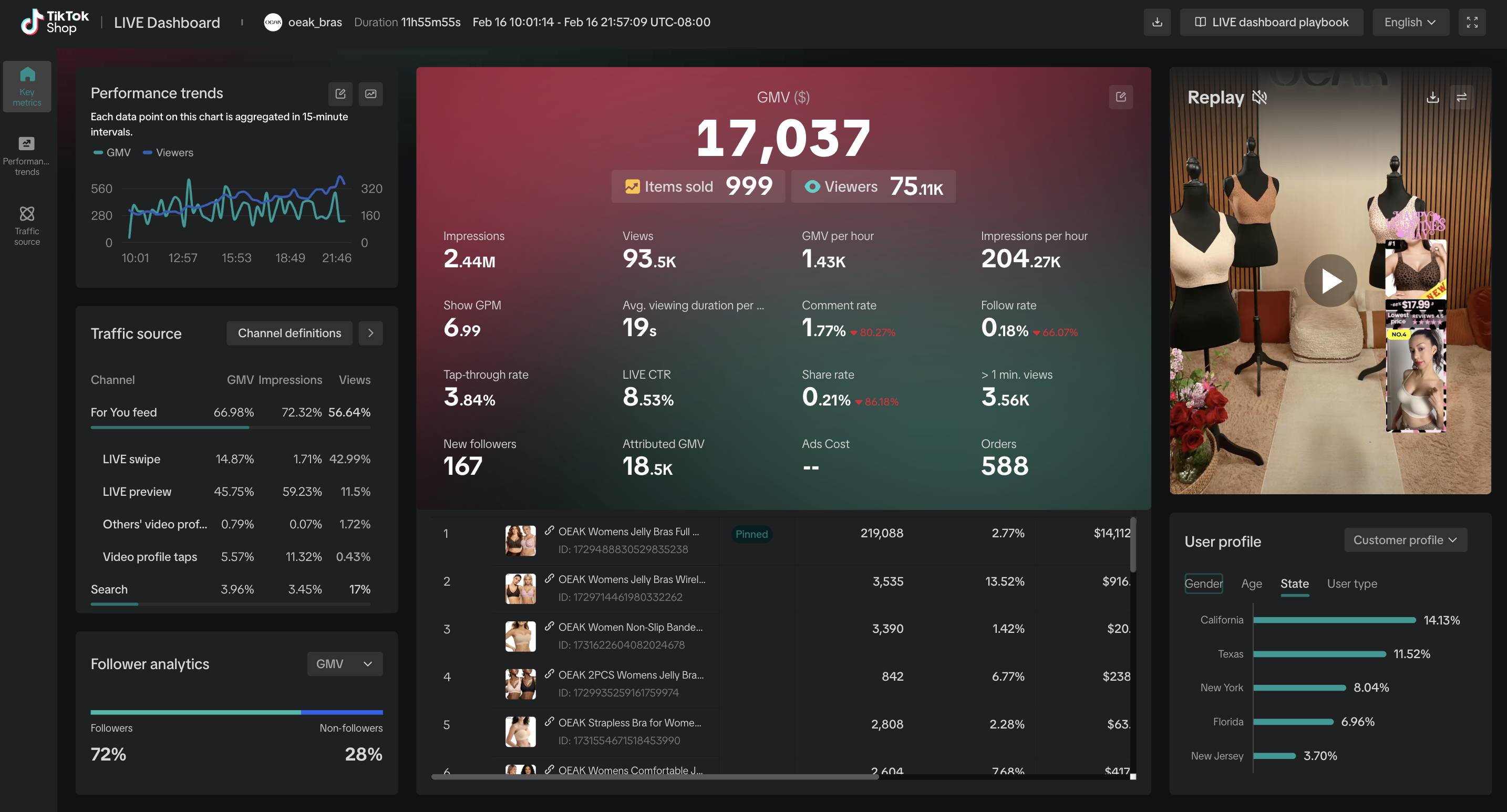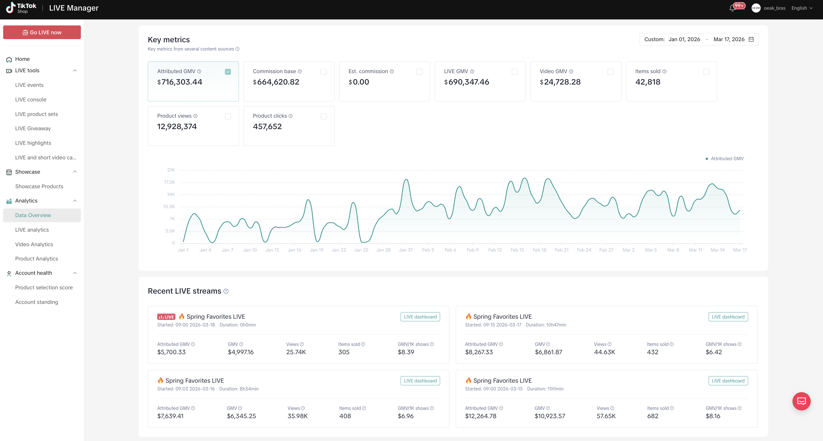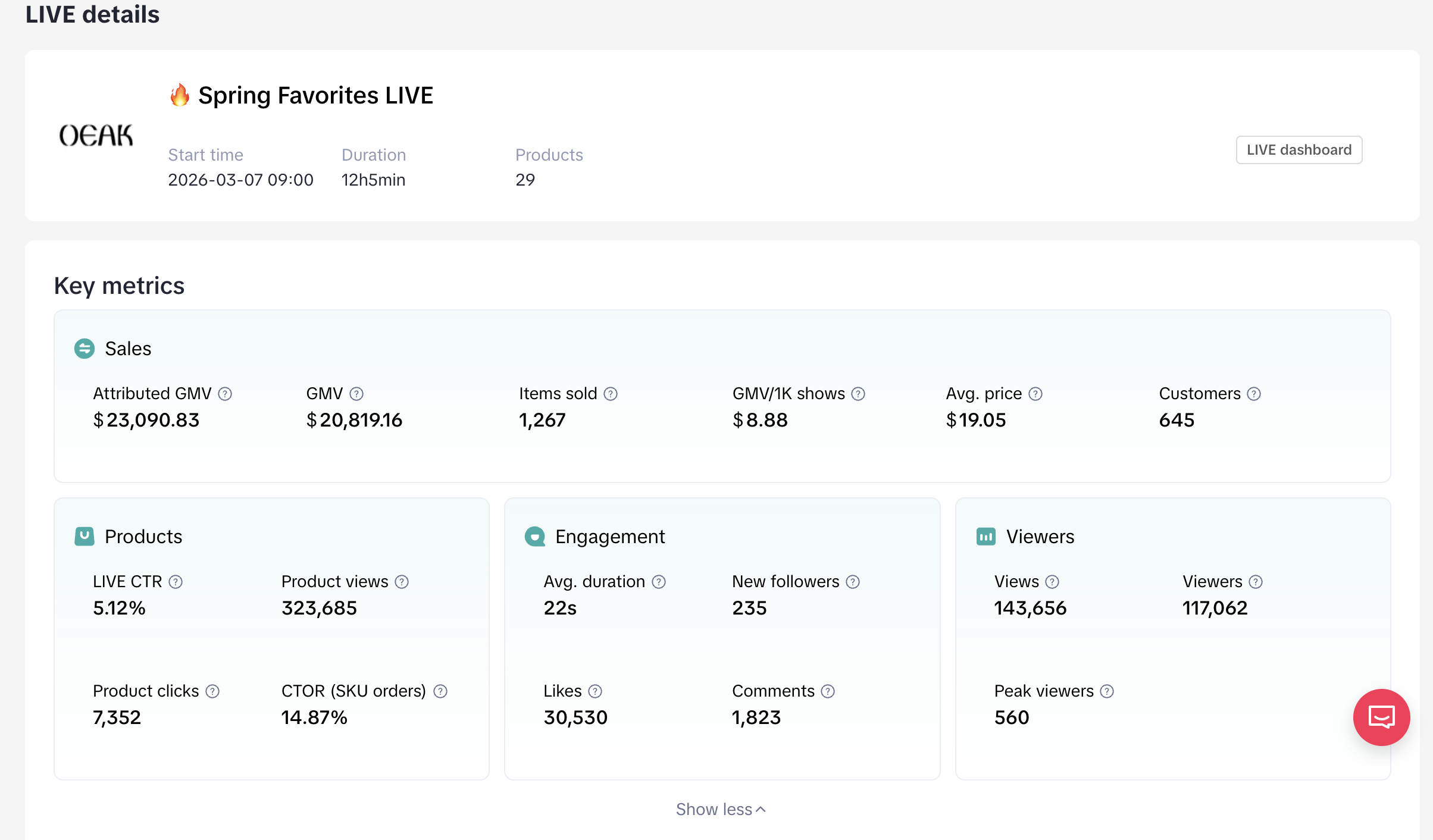 Leveraged real-time analytics and sales data to continuously refine strategies, resulting in over $700K in GMV year-to-date. By combining strategic planning, operational oversight, and performance-driven execution, helped establish OEAK Bras as a top-performing TikTok Shop account with strong audience engagement and sustainable revenue growth.